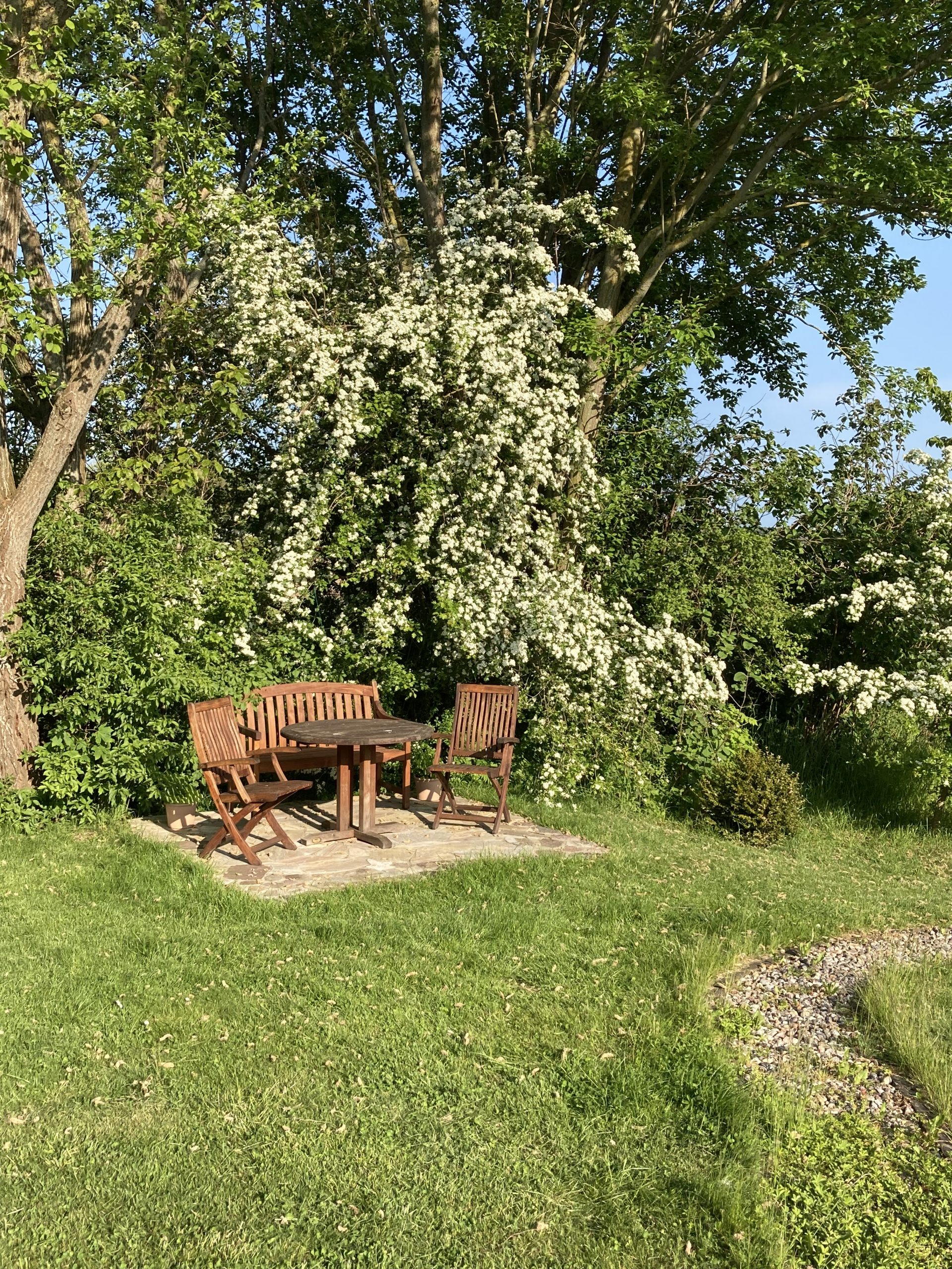 Ergänzend dazu sind im Garten auch zahlreiche Nutzpflanzen angelegt. Dazu gehören Kirsch- und Walnussbäume sowie verschiedene Beerensträucher wie Johannisbeeren, Stachelbeeren, Brombeeren, Himbeeren und Blaubeeren. Zusätzlich sind Weinreben vorhanden, die den Garten sowohl optisch bereichern als auch kulinarische Erträge liefern. Die Kombination aus Zier- und Nutzpflanzen sorgt für ein harmonisches Zusammenspiel von Ästhetik und Funktionalität.